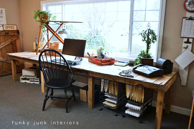 11. Farm Table Desk: At long last, my pallet farm table styled desk is up! This desktop is LONG. Measuring at 12 feet, the desk is prominent, yet proportioned with the sun filled picture window it faces. I LOVE that the windowsill provides a perfect spot for my little buddy to watch for those killer birds Warm woods against (via Funky Junk Interiors)