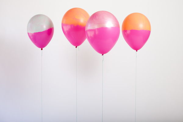 38. Two-Tone Balloons: A bouquet of balloons is quite possibly the easiest way to make any space feel like a party. Since they’ve become ever so commonplace, I wanted to bring a bit of a subtle artistic touch to our store bought balloons. Inspired by these balloons I wanted to try out painting the balloons a bright second hue to give (via A Subtle Revelry)