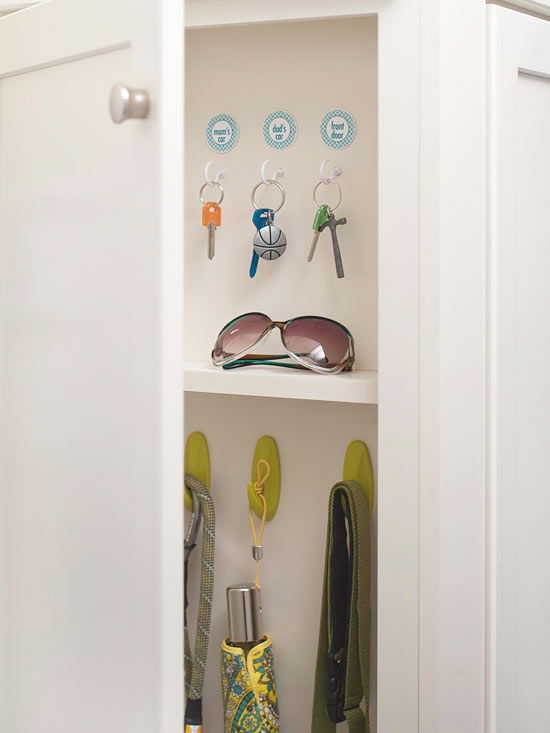 7. Add hooks to the back of a shallow cabinet near the family entry to keep track of keys: You don’t have to shell out the big bucks to get a beautifully organized kitchen. These affordable storage solutions let you keep your cash while making your own kitchen storage-rich. (via Better Homes and Gardens)
