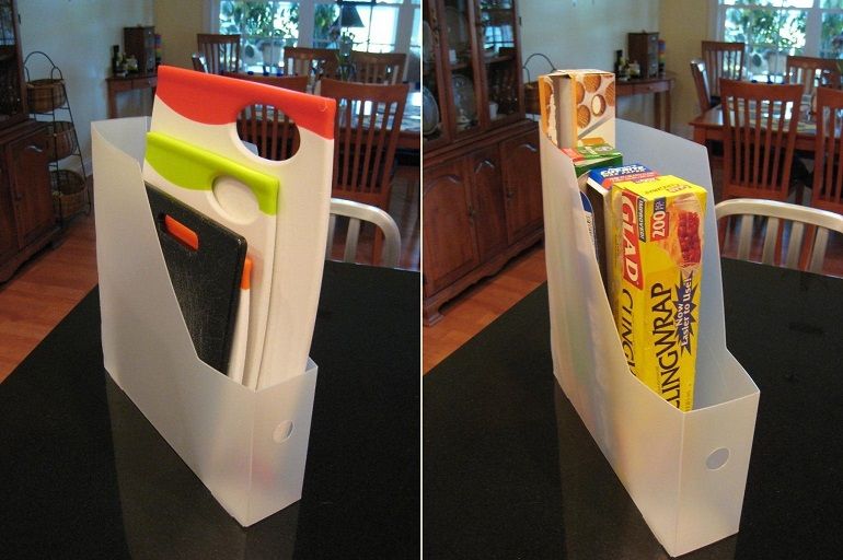 22. Use scrapbook paper organizers in the kitchen: Use 12×12 scrapbook paper vertical organizers for more than just paper. A few ideas for how to use them to organize your kitchen. (via Chica and Jo)