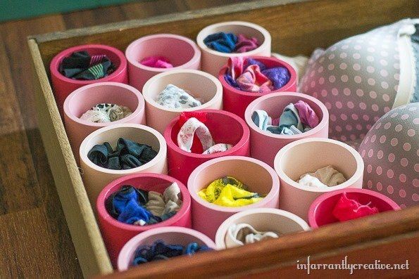 45. Organize Your Undies with PVC Pipes: I have an obsession with figuring out new ways to organize things. I have told you before how I am a huge fan of hidden storage. I am not a huge knick-nack decorator so having organized jars of t… (via Infarrantly Creative)