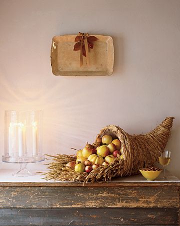 11. Cornucopia: A raffia cornucopia lined with a bed of dried wheat stalks holds an abundance of golden squashes, apples, and pears. Set on a wide sideboard or chest, it’s a natural Thanksgiving decorations that radiates good fortune. (via Martha Stewart)