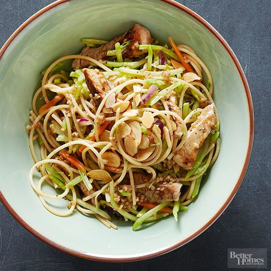 5. Pork and Noodle Bowl: This saucy spaghetti gains bold flavor from zesty marinated pork and crunchy texture from shredded slaw. (via Better Homes and Gardens)