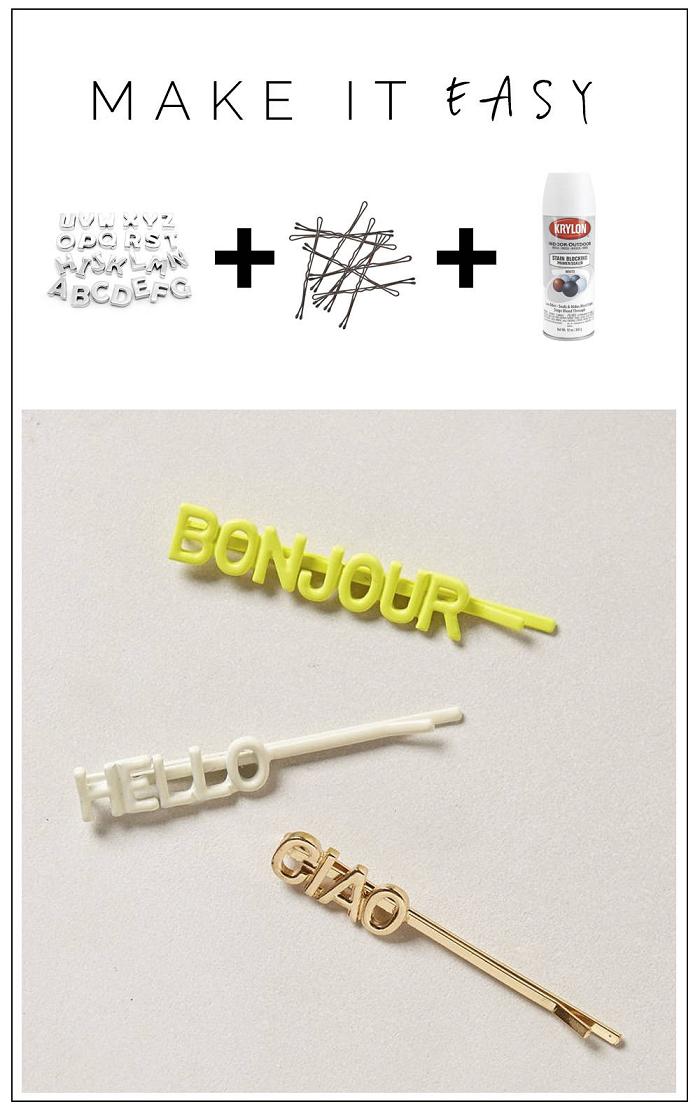 33. Word Up Hair Grips: Who wants to hide their hair grips when you can greet someone with them instead! The options are limitless as you don’t have to stick to just one word.Send a message (Positive Vibes) or make name hair grips for all you friends. No one will look at the back of your head the same way (via Fall for DIY)