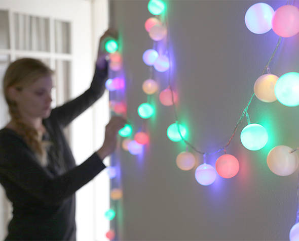 17. Ping Pong Ball Cafe Lights: Right now Edie sleeps with us in our bedroom. Sometimes she actually sleeps with us in bed in a LulyBoo (love that portable thing) and other times she sleeps in this cradle above in the corner by the door to the sunroom where the rest of her nursery is (see the full nursery tour here). (via Say Yes)