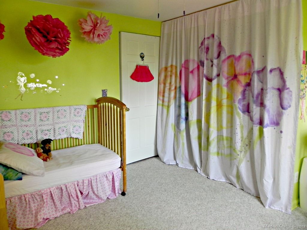 26. Watercolor Curtains: My daughters new bedroom has a nice closet, with a really useful organizer inside. The only problem is that it had no doors. There are tracks for bi-fold doors, but I don’t really like them to begin with, and I think they are an accident waiting to happen in a kids room. (via Mad in Crafts)