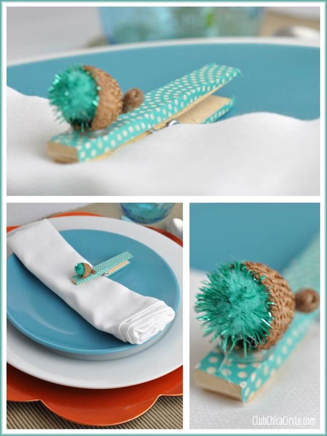 35. Clothespin Napkin Clips: Easy nature craft idea that combines acorns and colorful pom poms, washi tape, and clothespins for a great Fall napkin clip for dress up any table. (via Chica Circle)