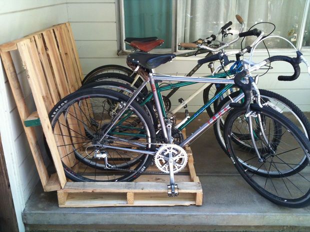19. Simple Pallet Bike Rack: I’m a lazy maker. I will live with problems for a long time, waiting until I stumble on the simplest, cheapest solution I can imagine. I find that I often end up with elegant, low-tech fixes that are easy to make as well as easy to live with. A recent problem that waited a good long time for a solution was my bicycle-littered porch. My wife and I agreed that we needed a rack to organize a family stable of bikes that numbers (via maudlin)