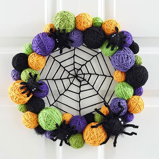 22. Yarn-Ball Wreath: Deck out your front door, porch, sidewalk, and yard with eerie Halloween decorations that cast a spooky spell over the whole neighborhood. Each easy Halloween ideas is made for outdoor displays and can weather the cold or rain. (via Better Homes and Gardens)