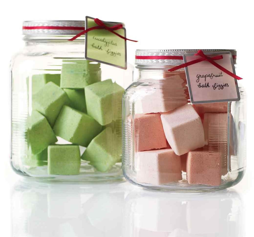 3. Bath Fizzies: Ice-cube trays serve as molds, giving the fizzies their shape. Using a flexible silicone model lets you slide the cubes out smoothly without breaking them. Show off the colors of the bath fizzies in glass jars with screw tops, the kind used for storing sugar and flour. Pack each type of fizzy in a separate jar so the scents won’t meld. Write the name of the scent on a vellum tag (choose a shade that matches the fizzies), and punch a hole in the top. Thread the tag with ribbon, and tie it around the jar. Citric acid, a common food additive, is available at wine-making-supply stores, some spice shops, and online. When citric acid is combined with baking soda and placed in water, a chemical reaction creates bubbles.*Makes 1 dozen (Use 2 per bath). (via Martha Stewart)