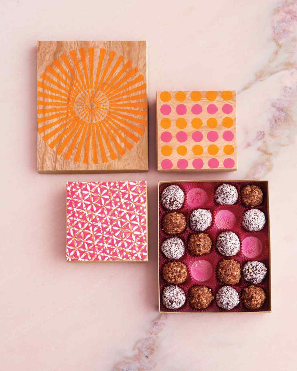 19. Stenciled Boxes: Sources Kraft boxes, 6″ by 5″ by 1″ and 3 1/2″ by 3 1/2″ by 1″, from $2.25 each, paperpresentation Cherry veneer adhesive sheets, by Barc, $4 for 8 1/2″ by 11″, artalternatives Mini sunburst (TCW166s), mini circle grid (TCW203s), and mini kaleidoscope (TCW347s) stencils, by the Crafters Workshop, 6″ by 6″, $5 each, simonsaysstamp Foam pouncer set, by Martha Stewart Crafts, $5 for 6, michaels. Note: For the heart box shown, we made a stencil with tape: Cut a piece of tape into a heart and adhere it to veneer, masking off a square around it. Then fill area outside heart with paint. (via Martha Stewart)