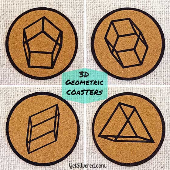 42. Faux 3D Geometric Shapes and Coaster: I’m sharing these Geometric Cutting shapes today. Geometrics are right on trend at the moment and I love the clean contemporary look of these faux 3D designs. I cut these with vinyl to use as a stencil to decorate some cork coasters. There’s 4 different designs included, so you can make a set! These coasters (via Get Silvered)
