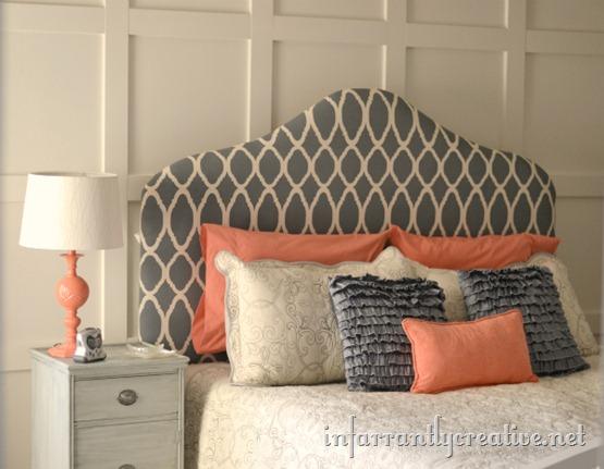 44. Painted and Stenciled Fabric Upholstered Headboard: I have been wanting to make an upholstered headboard for a while now but finding the perfect fabric often proves difficult, unless of course, I was willing to pay $50/yard. Why not stencil your own (via Infarrantly Creative)