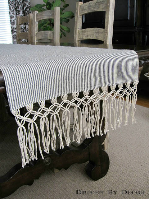 10. Macrame Fringe Table Runner: Happy Friday friends! Are you moms looking forward to a little bit of spoiling this weekend? Mothers Day weekend is one of my favorite weekends of the year I get to be part of all of the fun kid stuff but all of the less glamorous duties (fixing meals, breaking up sisterly arguments, etc.) fall to Mr. Driven by Dcor. I may even be putting in a request to have Mothers Day dinner in the dining room this year I just finished up making a table runner that that needs some oohing and aahing from the whole fam. (via Driven by Decor)