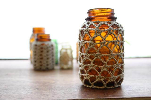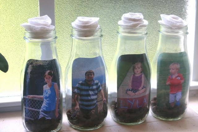47. Glass Bottle Picture Frames: I love all of the fun pictures Ive seen floating around on Pinterest lately of glass bottle frames. {here and here} This is such a fun, simple, and free project with so many great possibilities. I used empty Frappuccino bottles, coffee beans, and photographs. I printed all of the pictures out onto a piece of white printer paper from Word. I used rounded edges for the photos, and made them (via Line Across)