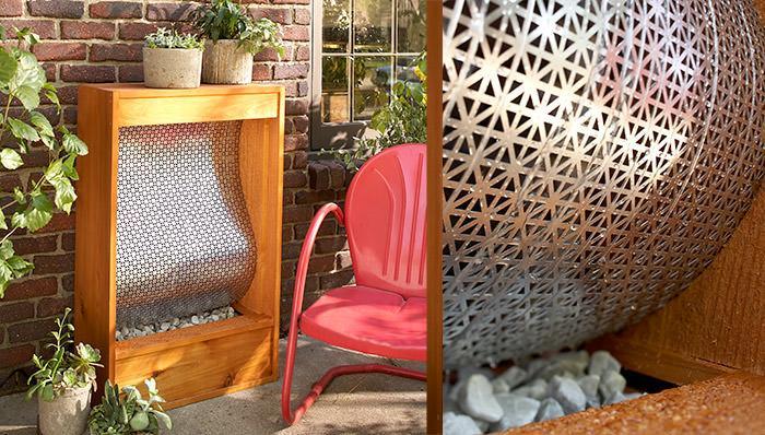 5. Soothing Water Fountain: Create a relaxing addition to your landscape with this unique water feature made from boards, some common plumbing parts, and a sheet of decorative aluminum. (via Lowes)