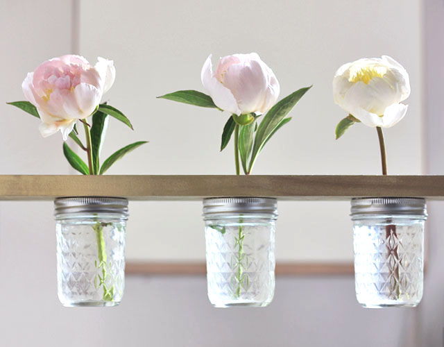 28. Hanging Flower Shelf: Fresh flowers are one of those things that make a house feel like a home. Give them a special place to bloom with this DIY mason jar flower shelf. Despite the little bits of sawing and drilling, this DIY is actually really easy! But if power tools aren’t really your thing, this is an excellent (via With Lovely)