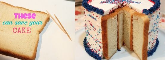 4. How to Keep Your Cake from Getting Stale: adding pieces of bread to the sliced part of cake will prevent the cake from going stale. The bread is held on with toothpicks. (via Created by Diane)