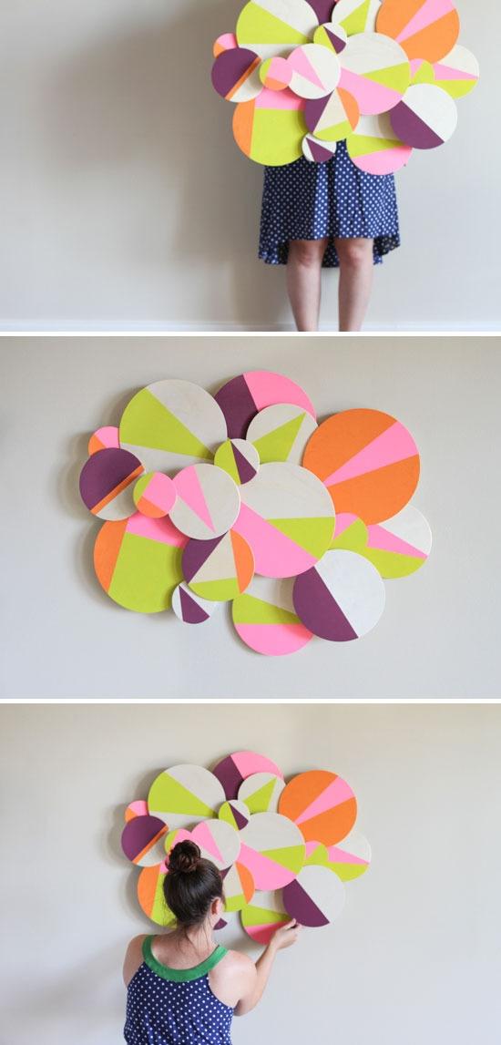45. Colorful 3D Geometric Wall Art: Inspired by an Anthropolgie installation I saw a few months ago, I created a three-dimensional piece of wall art that is easy to install and relatively inexpensive to make (the final budget came in under $50). Aside from wall art, this project also doubles as a photo booth prop, and if you have the time, it would make an awesome photo booth backdrop too. Want to learn how to make your own? Get the full tutorial and see the finished piece after the jump. Before you get started, I wanted to touch on color schemes for a second. I thought a… (via Curbly)