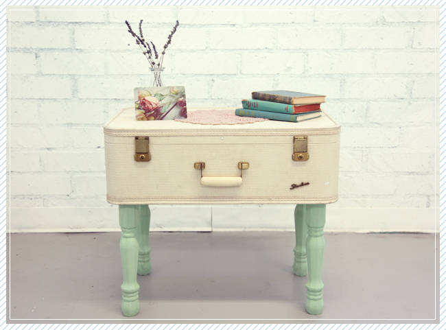 13. Coffee Table Suitcase: Materials: – Vintage suitcase – 4 Table legs – 8 Flat washers + 4 Wing nuts – Power drill- Paint + Paint brush – Measuring tool (yard stick, measuring tape, etc.)Directions: 1. Measure out where you want to position the table legs and mark it on the surface of the suitcase. 2. Use a power drill to create holes at the points that you marked. (via Ruche)