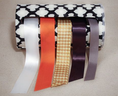30. Oatmeal-Box Ribbon Holder: Turn an oatmeal box, baby wipe container, corn meal box or any other cylindrical container into a fabric covered pretty ribbon container. Covering the container with a fun fabric could easily turn this into the perfect handmade gift for the crafty friends in your life. To see the step by step instructions and photographs, read on…. What you need: container fabric scissors tape measure straight edge utility knife spray adhesive fabric glue gimp or other trim for the top dowel rod (optional) What you do: 1. Using a straightedge, draw a one inch wide rectangle running the length of the… (via Curbly)