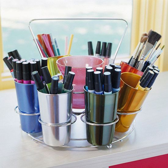50. Organize crafts supplies in multipiece serving sets: Try these creative and simple solutions to neatly store your crafts supplies. (via Better Homes and Gardens)