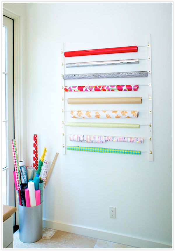 43. Wall-Mounted Wrapping Paper Organizer: Ever since Paper Source opened in town, we’ve been spoiled rotten when it comes to our wrapping paper selection. If you haven’t visited one of their stores, they have entire walls cover (via Camille Styles)