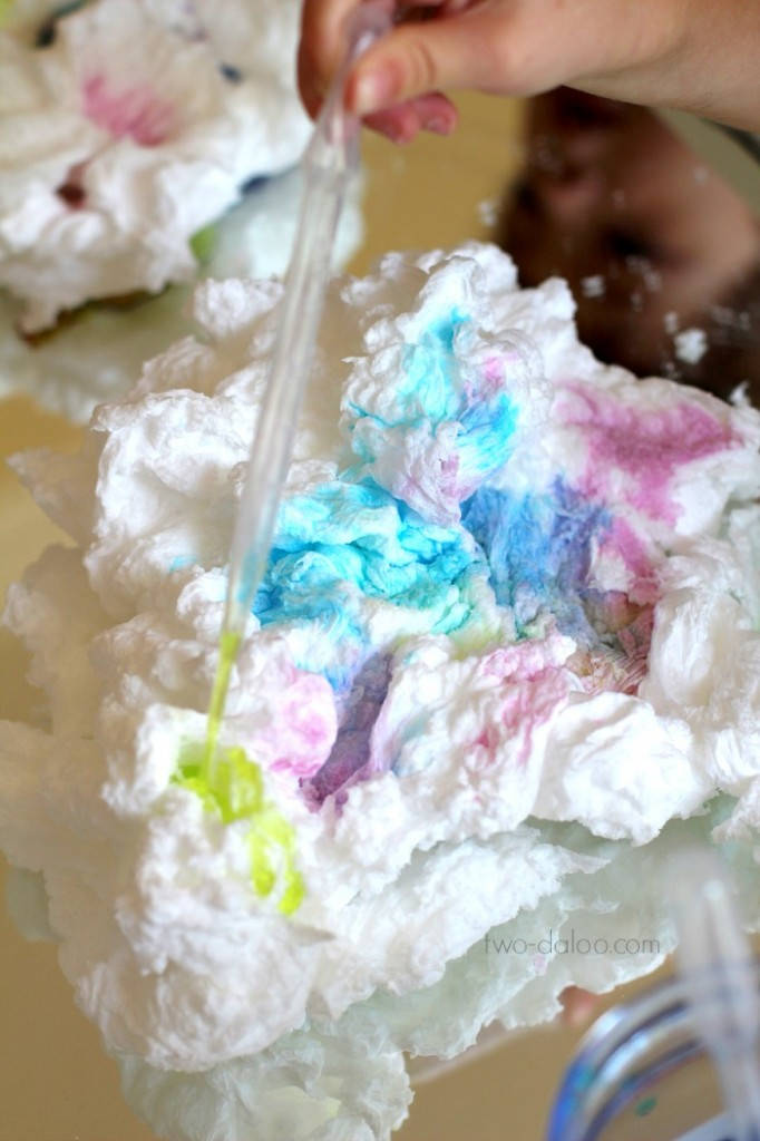 20. Puffy Rainbow Clouds: Make these fluffy, puffy, colorful rainbow clouds with just two common ingredients for some art, sensory, and science fun in one amazing activity! (via Twodaloo)