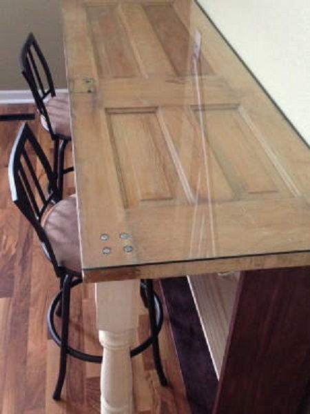31. Recycle an Old Door into New Desk: Handy father recycled an old door into a new desk. The desk has shelving storage underneath with banister front legs and a glass top. (via Handy Father)