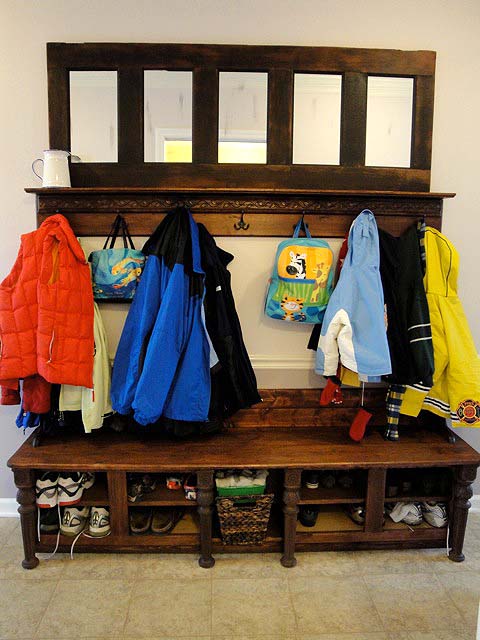 35. Coat Rack made from an Old Door: We have a great mudroom area in our house, but when we moved in we didn’t have anywhere to store our shoes, and all we had to hang our coats on were a few peg hooks behind the door. Not very efficient or attractive in my opinion. I started planning out the storage bench and (via Pretty Handy Girl)