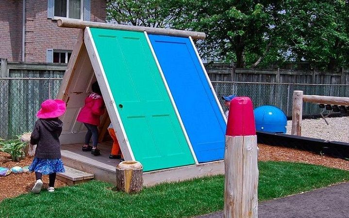 37. Playhouse from Old Doors: A natural playground for the children of Lake shore cooperative nursery school playground was designed and built by Earthscape (via Earth Scape)