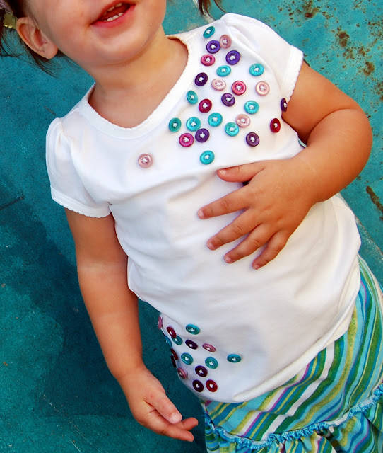 Button Explosion Tee5. Button Explosion Tee: I was gifted a big stash of buttons that looked so pretty together, I also had a couple of my favorite Target t-shirts that needed some primping, so I put them together and this is what I came up with: a little bit of a button explosion, but I think it turned out fun, and(…) (via iCandy Handmade)