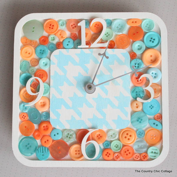 14. Button Clock: My DIY button clock is perfect for a craft room or any other room in your home. Change up the colors of the buttons to match your home decor. This would also make a great addition to a kids room. This DIY button clock is super simple to make as well. DIY Button Clock Supplies: (via The Country Chic Cottage)