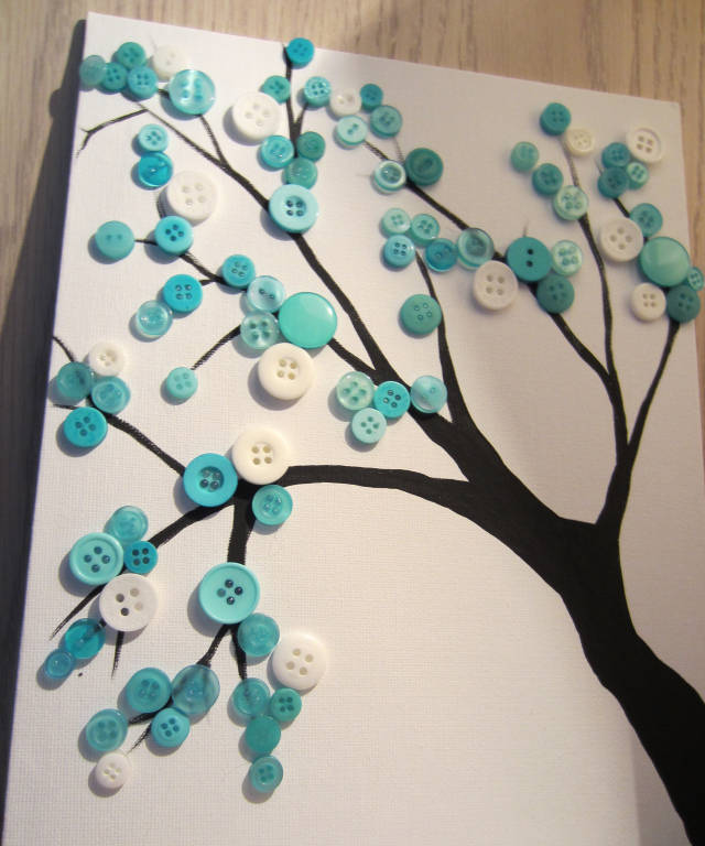 15. Button Art: This fun button art craft is sure to be a hit for kids of all ages (just keep a close eye on younger children who might be tempted to put them in their mouth!)! Begin by choosing your design and painting an image on to a blank canvas. We used a bare tree for our…Read More (via Simply Designing with Ashley Phipps)
