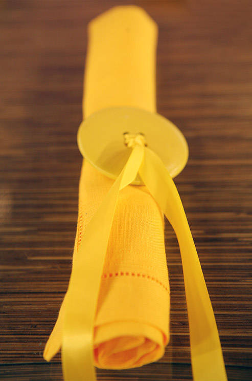 18. Button Napkin Rings: For a casual reception, rehearsal dinner or morning-after brunch, use oversized buttons and napkins in bright colors to add a festive pop to your table. (via Colin Cowie Weddings)