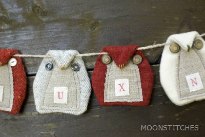 47. Owl Pennant: Quick and easy to make, these owls can be used for Christmas (“Joyeux Noel”), birthdays or any other occasion that might be celebrated. You need: – wool – linen – fusible web – buttons – muslin – iron on interface… (via Moonstitches)