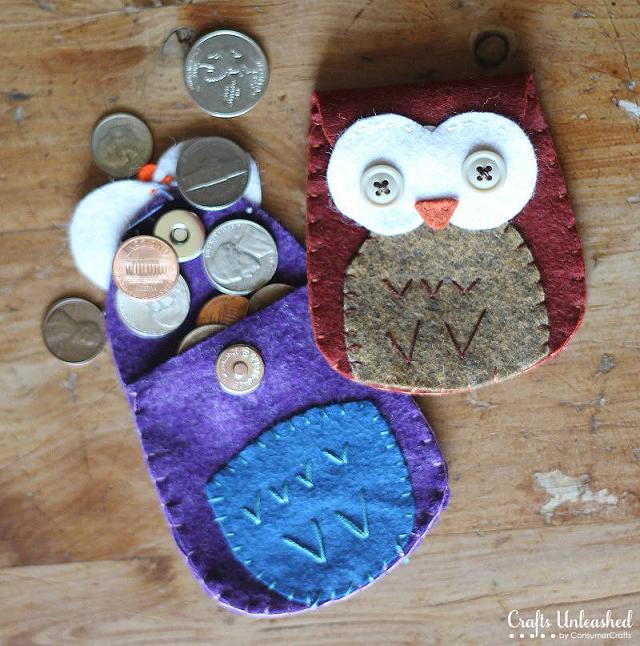 43. Felt Owl Coin Purses: This adorable felt owl coin purse project is one even a beginning stitches can accomplish. They are easy to make and close securely with a magnetic clasp! (via Crafts Unleashed)