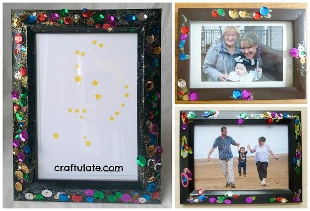 30. Sparkly Photo Frames: These sparkly photo frames are an easy way to get kids involved in making gifts. Uses glue and sequins. (via Craftulate)