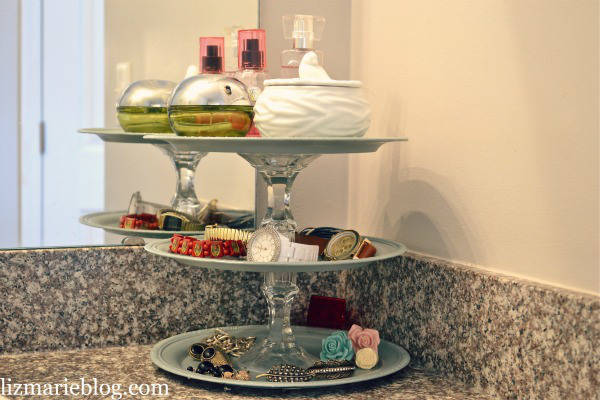 10. Dollar Store Tiered Tray: Master bathroom organizing ideas (via Liz Marie Blog)