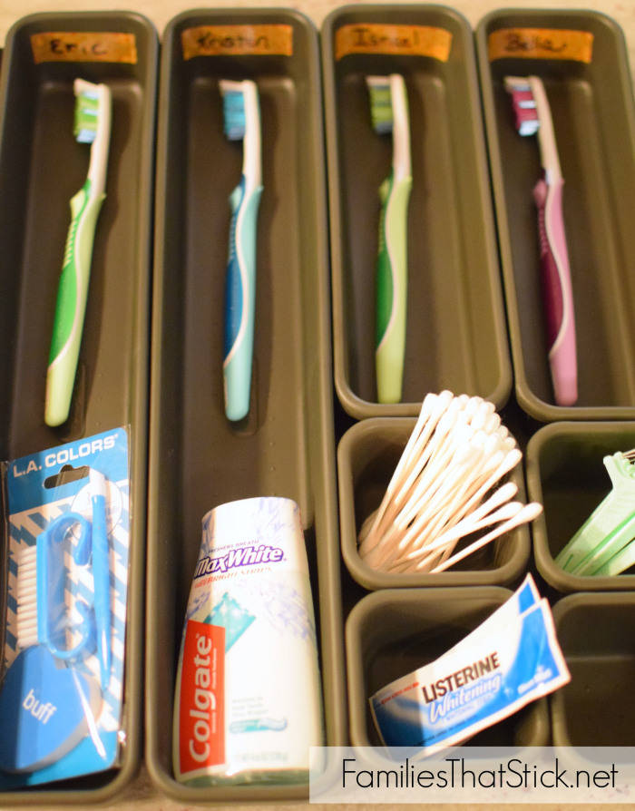 45. Use desk organizer tray to keep toothbrushes organized: We all have hot spots. We battle with crazy cords, billowing receipts, and messy bathroom drawers. Check out this {easy} home organization hack list! (via Families that Stick)