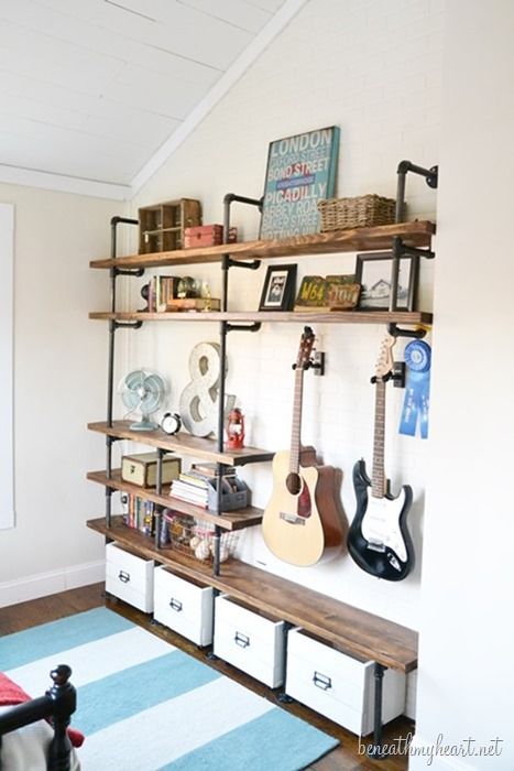 25. Industrial Shelves: Today, I am going to show you how to build industrial shelves.This was a new experience for me, so I just learned as I went along. But first let me show you the inspiration that got my wheels a turnin for this project.Boys Room Shelves @Jessica Kraus on A Beautiful Mess I had considered doing pallet wood walls, but when I saw that picture last year, I KNEW that I wanted to build something like it that in Jonathan and Luke’s room. Their room is a long, narrow room, and each side of the room is their space.When we were building the walls in their room, {a veeeerrrrry long time ago} we covered one wall on each side with faux brick paneling from Lowes. { Read More } (via Beneath My Heart)