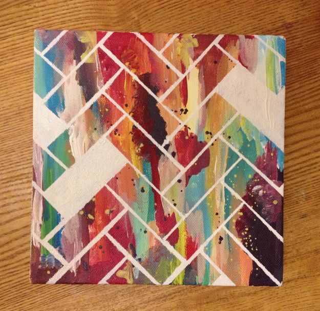 11. Abstract Stripes On Canvas: 1 & 2. So firstly try and come up with some sort of colour scheme or at least colours that you think might go together and contrast well. Keep working on it until your happy, there is no set way to do this. You could do swirls, blobs, lines, whatever… (via ooh I Like That)