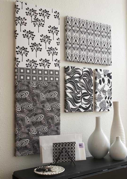 26. Fabric Art Wall Hanging: If you have fat quarters you cant bear to cut into small pieces, combine them with larger pieces to cover purchased stretched artists canvases. Black-and-white florals and prints, such as these from the Night and Day 2 collection for Robert Kaufman Fabrics, make striking wall art. (via All People Quilt)
