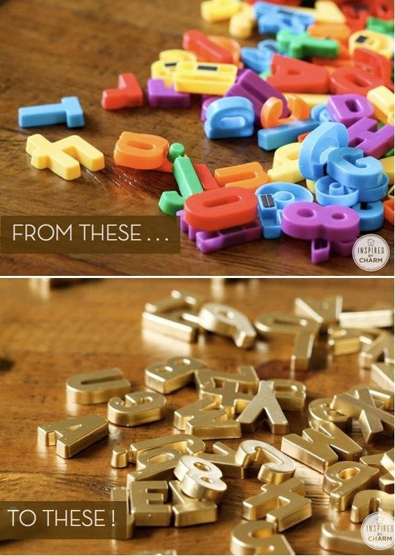 8. Gold Magnetic Letters: Okay, so I have a super easy and totally fabulous I Create for you today! You know how much I’m loving gold these days. Well, Im taking it to a whole new level with this project. As much as I wish I could take credit for the awesomeness, I actually saw the idea on Pinterest. (via Inspired by Charm)
