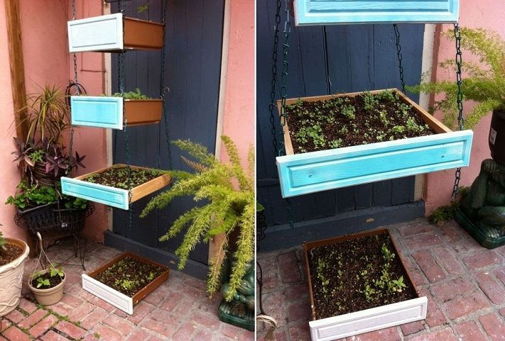 39. Hanging Vegetable Garden: Ellen Macomber is my neighbor. When her kitchen cabinets were being replaced she hated to see them trashed, so she came up with a very creative solution: using them as containers to grow a vegetable garden. Only one more challenge We live in the French Quarter in New Orleans, as do rats and mice. Ellen’s plan wasn’t to help these vermin get their roughage, no. Instead, Ellen made a hanging garden.Genius! (via Design Envy)