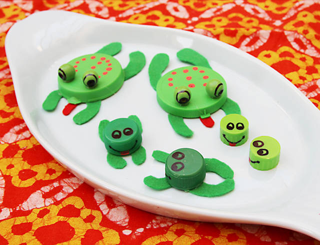 8. Bottle Cap Frogs: Been saving those plastic lids and colored bottle caps for crafting? Good thing, since I’ve finally come up with a cute little project for those that happen to be green bottle cap frogs of course! You can use these to decorate… (via Creative Jewish Mom)