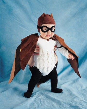 47. Maked Owl Costume: Give a fledgling aviator wings in the form of a felt owl costume. Contoured brown and white feathers, made by cutting and creasing the fabric, adorn the wings and belly; perked-up ears are attached to a jaunty pilot’s cap. Goggled peepers enhance the look. (via Martha Stewart)