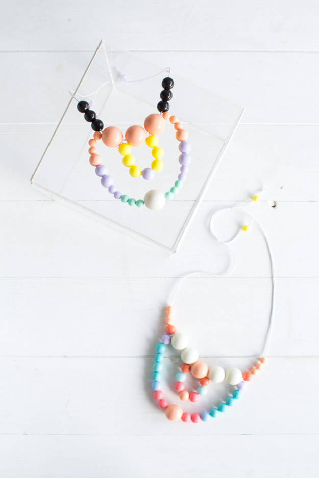 33. Easy Beaded Necklaces: I am one of those people who finds wearing colour difficult. I spend so much time eyeing up colourful jumpers and dresses only to realize the poor thing would spend more time in the back of my wardrobe in favour of that black cozy jumper that I’ve been wearing three days straight already. But the (via Fall For DIY)