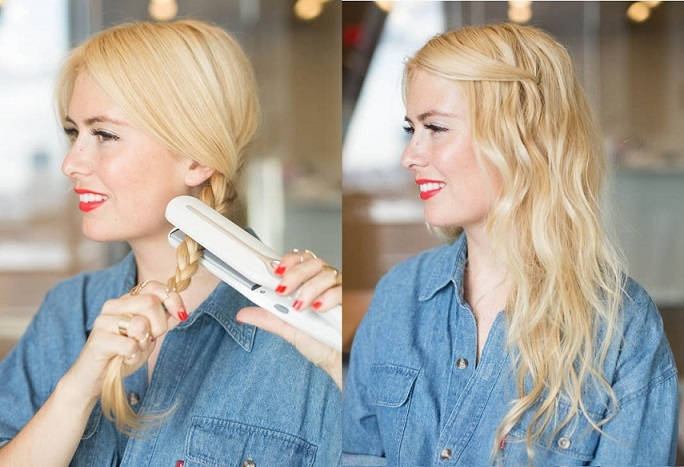 8 Braid your hair, then heat it up by pressing a flat iron over it to make imperfect waves