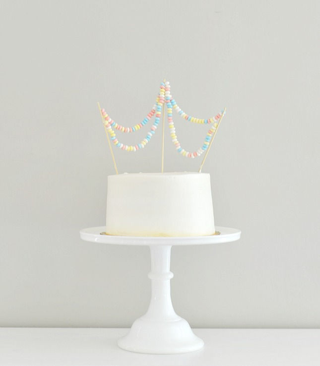 48. Candy Necklace Cake Topper: From the time we were little kids playing dress up with colorful candy necklaces, these pretty jewelry-inspired treats have delighted both our sense of playful style and taste for sweets. Now that we’re all grown up, throwing festive soirees, and fashioning celebrations for reasons big and small, we think it’s time to bring these fun candy necklaces back into the mix. This time, however, our celebration cake will be the one playing dress up! With nostalgic and festive sensibility,this candy garland DIY cake topper is easy, quick, and super affordable. Best of all, it’s completely edible! CANDY NECKLACE CAKE TOPPER CANDY NECKLACE CAKE TOPPER MATERIALS: Scissors 4 candy necklaces 2 natural bamboo skewers (12″ long each) Needle nose pliers STEP BY STEPCANDY NECKLACE CAKE TOPPER INSTRUCTIONS: 1.Take one candy necklace, and cut it in one spot. Be careful to grab each end of the newly cut necklace so that the candy beads remain on the necklace […] (via Best Friends for Frosting)
